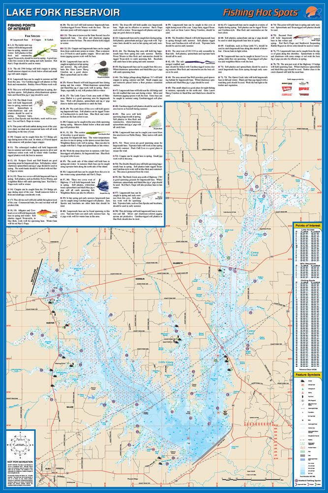 Regarded as the best bass lake in Texas and one of the top in the U.S. The six heaviest largemouth bass on record and 36 of the 50 largest bass in Texas came from Fork. There's good crappie here. This map is clean, easy-to-read, and detailed map of the lake. It has a latitude/longitude grid and GPS coordinates. Fishing tips and techniques are included. Size - 24 x 36