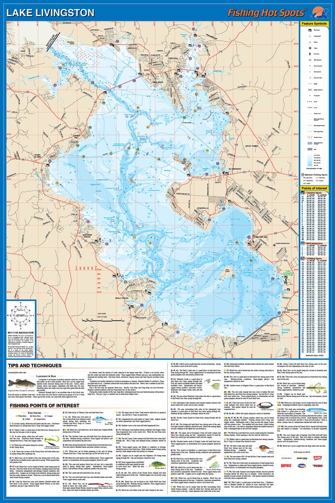 A productive and diverse fishery. Although the greatest amount of fishing pressure is applied to the abundant white bass population, Livingston is also a great crappie, catfish, striper (pure and hybrid) and black bass resource. This map is clean, easy-to-read, and detailed map of the lake. It has a latitude/longitude grid and GPS coordinates. Fishing tips and techniques are included. Size - 24 x 36